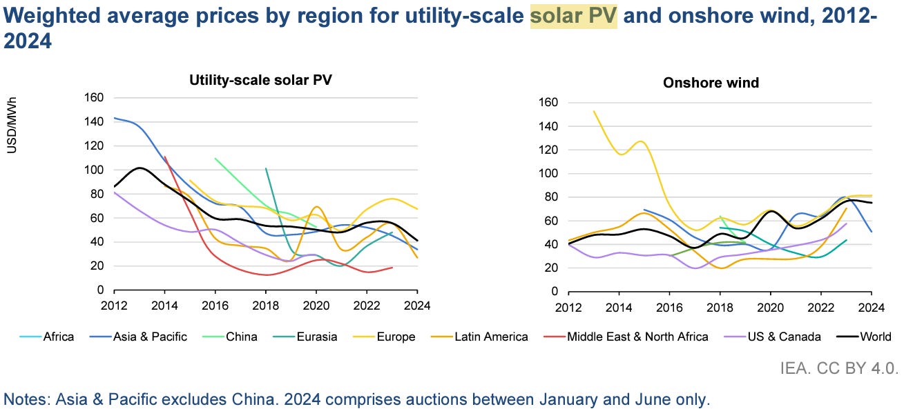 Los precios de los contratos de energía solar fotovoltaica (PV) continúan en descenso, mientras que la presión inflacionaria persiste para la energía eólica terrestre. En la última década, los precios promedio de subasta para proyectos solares a escala industrial han disminuido continuamente en todas las regiones, alcanzando un promedio de 40 $/MWh en la primera mitad de 2024. Este descenso se debe en gran parte a India, líder en capacidad adjudicada, con un precio de subasta de 34 $/MWh. En contraste, Europa obtuvo un precio promedio de 67 $/MWh para proyectos adjudicados en 2024, reflejando una reducción del 11%.