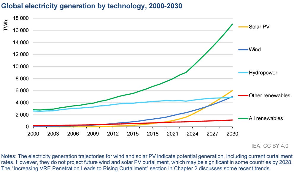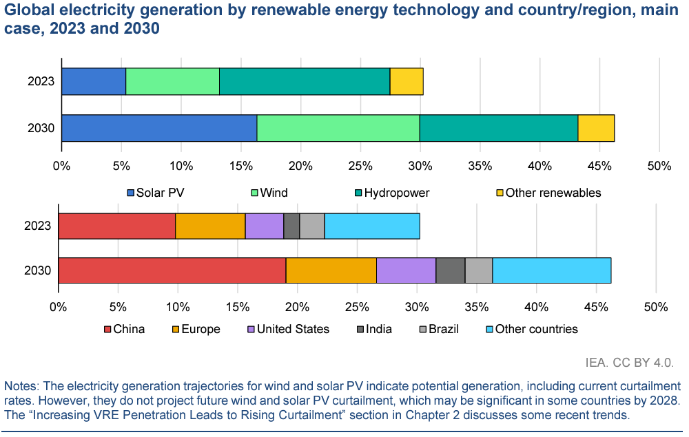 Para 2030, se espera que la generación mundial de electricidad renovable alcance más de 17.000 TWh, lo que representa un incremento de casi un 90% respecto a 2023, suficiente para cubrir la demanda combinada de China y EE. UU. En los próximos seis años, se lograrán hitos importantes: