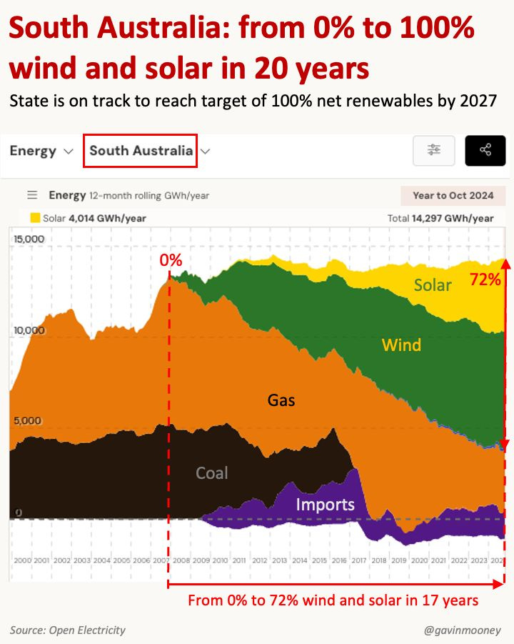 Interesante post de Gavin Mooney en el que comparte datos del parque de generación eléctrica en el sur de Australia. Ha pasado de 0% de renovables en 2007 a un 72,1% en 2024, sin contar con energía hidroeléctrica. La tendencia muestra un avance continuo de la energía eólica y solar, mientras que el gas tendrá un papel cada vez menor y servirá para suplir las carencias de las anteriores.