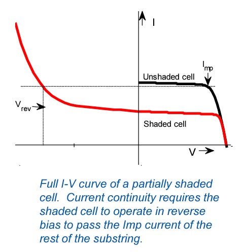 Cuándo una célula fotovoltaica se encuentra dañada o sombreada, esta pasará de generar a probablemente consumir electricidad (dependerá del punto de operación):