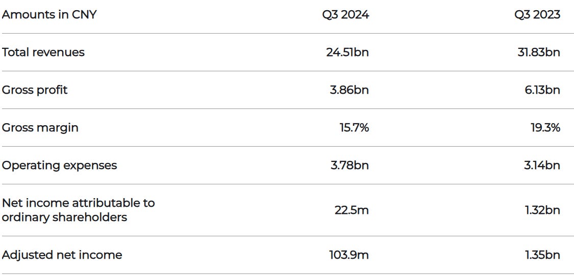Los ingresos totales del tercer trimestre fueron de 24,51 mil millones de Yuanes (3,44 mil millones de dólares), lo que representa una caída del 23% en términos anuales debido a los precios en bajada y “sin frenos”.